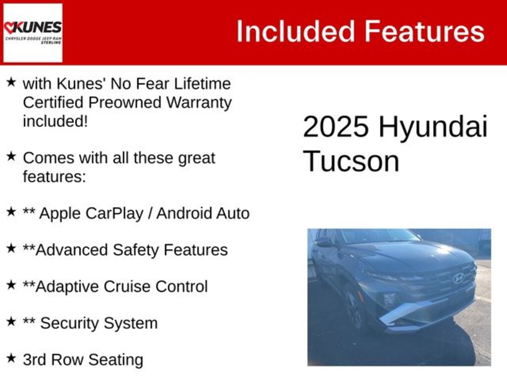 Ecotronic Gray 2025 Hyundai Tucson SEL SEL with Kunes' No Fear Lifetime Certified Preowned Warranty included!, Comes with all these great features:, ** Apple CarPlay / Android Auto, **Advanced Safety Features, **Adaptive Cruise Control, ** Security System, 3rd Row Seating, ** Steering Wheel Controls, ** Keyless Entry, ** Automatic Headlights, ** Bluetooth, ** Back up Camera, **SIRIUS XM, Option Group 01. Recent Arrival!