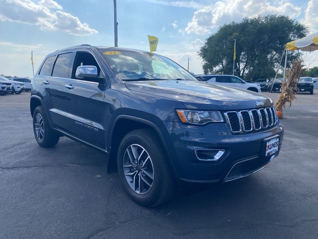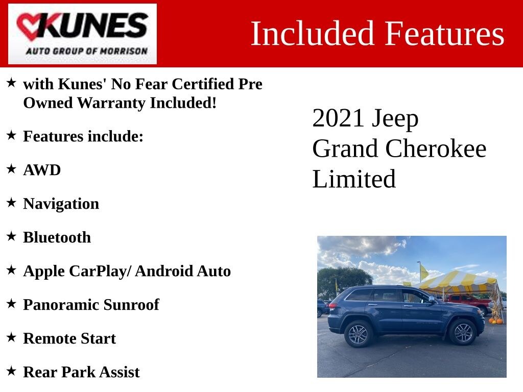 Pacific Blue Clearcoat 2021 Jeep Grand Cherokee Pricing includes $2000 Trade In Assistance, and incentive to finance with Dealership. Must trade in 10 year or newer vehicle with less than 100,000 miles. with Kunes' No Fear Certified Pre Owned Warranty Included!, Features include:, AWD, Navigation, Bluetooth, Apple CarPlay/ Android Auto, Panoramic Sunroof, Remote Start, Rear Park Assist, Heated Steering Wheel, Heated/Cooled Seating, Backup Camera, Grand Cherokee Limited, 4D Sport Utility, 4WD, Pacific Blue Clearcoat, Black Leather, 7 & 4 Pin Wiring Harness, Cargo Compartment Cover, Class IV Receiver Hitch, Dual-Pane Panoramic Sunroof, Heated Second Row Seats, Heavy-Duty Engine Cooling, Leather Trim Seats w/Perforated Inserts, Luxury Group II, Navigation System, Power Tilt/Telescope Steering Column, Quick Order Package 2BH, Rain Sensitive Windshield Wipers, Rear Load Leveling Suspension, Trailer Tow Group IV, Ventilated Front Seats. Recent Arrival! Odometer is 14984 miles below market average!