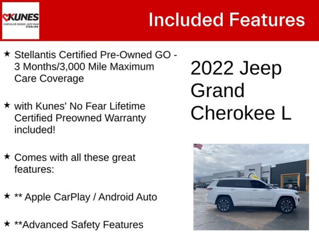 Bright White Clearcoat 2022 Jeep Grand Cherokee L Overland Overland Stellantis Certified Pre-Owned GO - 3 Months/3,000 Mile Maximum Care Coverage, with Kunes' No Fear Lifetime Certified Preowned Warranty included!, Comes with all these great features:, ** Apple CarPlay / Android Auto, **Advanced Safety Features, **Adaptive Cruise Control, ** Navigation, ** Security System, *** Moonroof/sunroof, **Panoramic Sunroof, ** Heated Seats, **Heated and Cooled Seats, **Heated Steering wheel, **Heated Rear Seating, 3rd Row Seating, ** Steering Wheel Controls, ** Premium Wheels, ** Keyless Entry, ** Automatic Headlights, ** Bluetooth, ** Back up Camera, **Rear Park Assist, **SIRIUS XM, Remote Start, 10 Speakers, 10.1" Touchscreen Display, 19 Speakers High Performance Audio, 2nd Row Manual Window Shades, 4G LTE Wi-Fi Hot Spot, 950 Watt Amplifier, Active Noise Control System, All Radio Equipped Vehicles, Apple CarPlay, Audio memory, Disassociated Touchscreen Display, Emergency communication system, For More Info, Call 800-643-2112, Front Passenger Power Seat Back Massage, Google Android Auto, GPS Antenna Input, GPS Navigation, HD Radio, Integrated Center Stack Radio, Integrated Voice Command w/Bluetooth, Nappa Leather Seats (TL), Normal Duty Suspension, Power Adjust 12-Way Driver Seat, Power Adjust 12-Way Front Passenger Seat, Power Fold Seatbacks, Radio data system, Radio: Uconnect 5 Nav w/10.1" Display, Radio: Uconnect 5 Nav w/8.4" Display, Rearview Autodim Digital Display Mirror, Reclining 3rd row seat, Steering wheel mounted audio controls, USB Host Flip, Voltmeter, Wheels: 20" x 8.5" Machined Face Aluminum, Wireless Charging Pad. Recent Arrival!