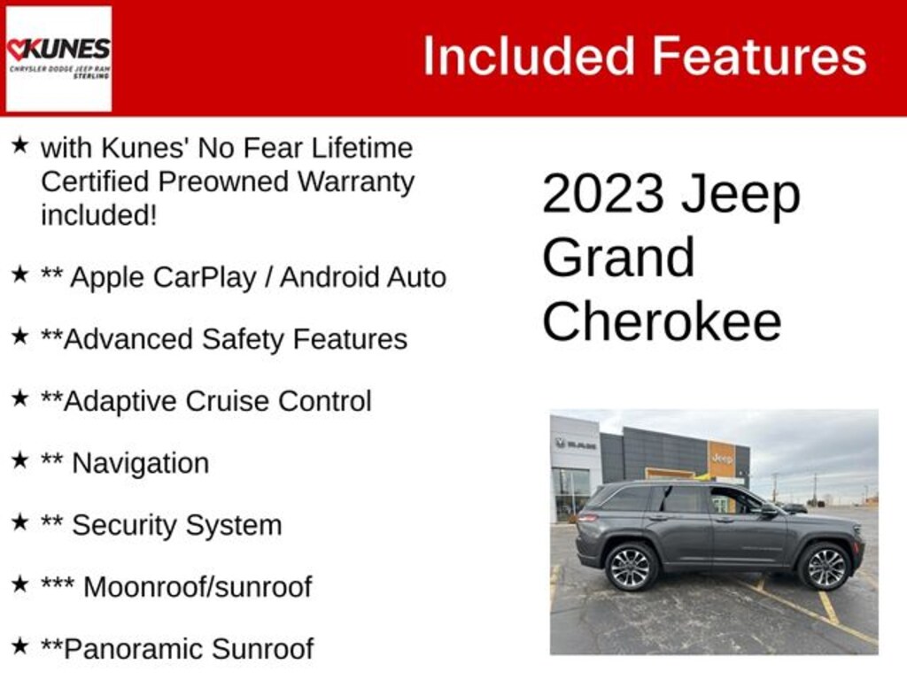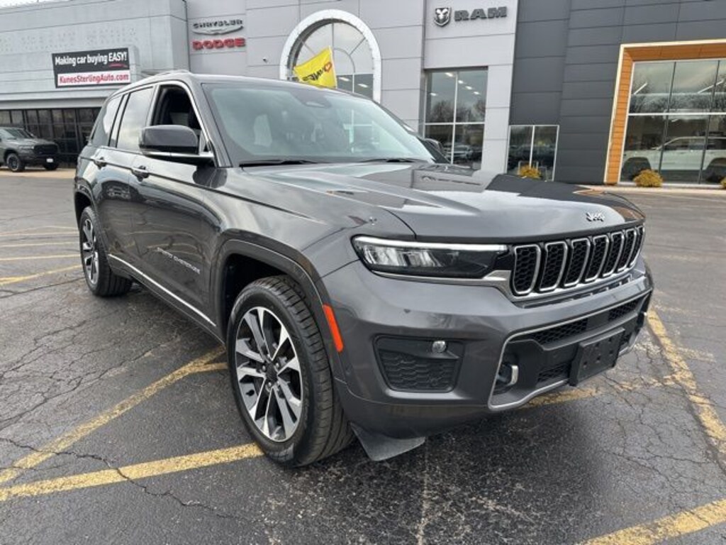 Baltic Gray Metallic Clearcoat 2023 Jeep Grand Cherokee Overland Overland with Kunes' No Fear Lifetime Certified Preowned Warranty included!, ** Apple CarPlay / Android Auto, **Advanced Safety Features, **Adaptive Cruise Control, ** Navigation, ** Security System, *** Moonroof/sunroof, **Panoramic Sunroof, **Heated and Cooled Seats, **Heated Steering wheel, **Heated Rear Seating, ** Steering Wheel Controls, ** Roof Rack, ** Keyless Entry, ** Automatic Headlights, ** Bluetooth, ** Back up Camera, **Rear Park Assist, **SIRIUS XM, Remote Start, Grand Cherokee Overland, 4D Sport Utility, 4WD, Baltic Gray Metallic Clearcoat, Global Black Leather, 10 Speakers, Active Noise Control System, Anti-whiplash front head restraints, Audio memory, Auto-leveling suspension, Compass, Delay-off headlights, Driver door bin, Emergency communication system, Four wheel independent suspension, Front anti-roll bar, Front Bucket Seats, Front Center Armrest w/Storage, Front dual zone A/C, Illuminated entry, Navigation System, Normal Duty Suspension, Occupant sensing airbag, Outside temperature display, Overhead airbag, Overhead console, Panic alarm, Passenger door bin, Passenger vanity mirror, Quick Order Package 23N, Radio data system, Radio: Uconnect 5 Nav w/10.1" Display, Rear reading lights, Rear seat center armrest, Speed-Sensitive Wipers, Split folding rear seat, Tilt steering wheel, Turn signal indicator mirrors, Voltmeter. Recent Arrival!
