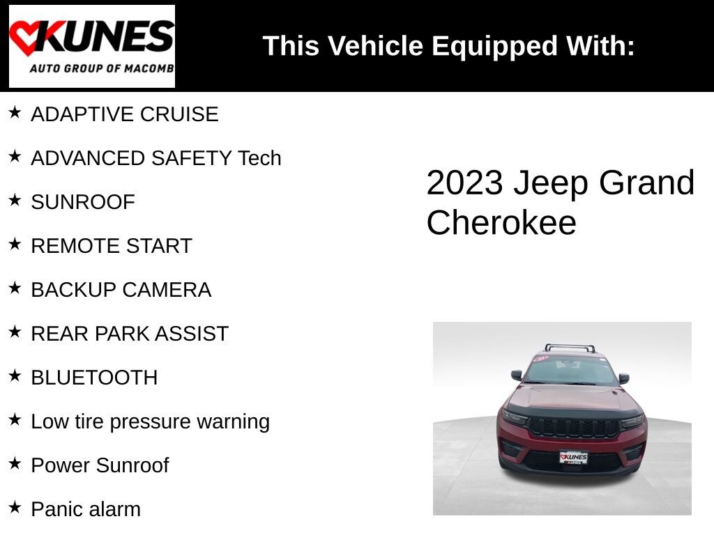 2023 Jeep Grand Cherokee Altitude ADAPTIVE CRUISE, ADVANCED SAFETY Tech, SUNROOF, REMOTE START, BACKUP CAMERA, REAR PARK ASSIST, BLUETOOTH, 4WD, Cloth Seats, Front Bucket Seats, Low tire pressure warning, Outside temperature display, Overhead console, Panic alarm, Passenger door bin, Power Sunroof, Rear Load-Levelling Suspension, Rear reading lights, Rear window wiper, Speed-Sensitive Wipers, Split folding rear seat, Tachometer, Telescoping steering wheel, Tilt steering wheel, Variably intermittent wipers, Voltmeter, Wheels: 17" x 6.5" Fully Painted Aluminum. Velvet Red Pearlcoat