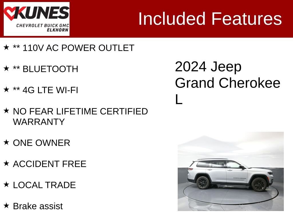 ** APPLE CAR PLAY / ANDROID AUTO, ** LEATHER, ** REMOTE START, ** HEATED STEERING WHEEL, ** HEATED SEATS, ** BACKUP CAMERA, ** NAVIGATION, ** WIRELESS CHARING, ** REAR PARK ASSIST, ** 110V AC POWER OUTLET, ** BLUETOOTH, ** 4G LTE WI-FI, NO FEAR LIFETIME CERTIFIED WARRANTY, ONE OWNER, ACCIDENT FREE, LOCAL TRADE, Brake assist.Certified. Certification Program Details:** NO FEAR LIFETIME CERTIFIED PREOWNED **Over $2,895 of value at no cost!*LIFETIME WARRANTY!*3 Day Exchange Policy!*Complimentary powertrain warranty with ability to upgrade to fully comprehensive coverage and/or extend up to 125,000 miles!*125+ Point Inspection by our factory trained ASE Certified technicians and reconditioned to the highest standards.*Complimentary AutoCheck History Report*Complimentary AutoCheck Buyback Protection*Financing for Everyone - Guaranteed credit approval regardless of credit history!*Over 30 lenders who compete to get you the best financing terms*No payments for up to 90 days!*Weekly, Bi-Weekly, and Monthly Payment Options for all buyers!*First Free Oil Change!*Trade anytime policy - cars, trucks, boats, RVs, motorcycles - as long as we donât have to feed it, you can trade it!2024 Jeep Grand Cherokee L Altitude 3.6L V6 24V VVT 8-Speed Automatic 4WD Clean CARFAX. CARFAX One-Owner.Find out why our dealerships have won DealerRater.com DEALER OF THE YEAR a whopping 10 TIMES! Call, email, or live chat with one of our friendly sales professionals now to schedule your test drive! Ask about some of our other Chevrolet, GMC, Buick, Ford, Chrysler, Dodge, Jeep, Ram, Tesla, Kia, Hyundai, INFINITI, BMW, Mercedes, Toyota, Lexus, Nissan, Volkswagen, Hummer, Lincoln, Mazda, Mitsubishi, Honda, Acura, and other vehicles that may have navigation, sunroof, adaptive cruise control, leather, cooled seats, blind spot monitor, lane keep assist, panoramic moonroof, tow hitch, Bose audio, Harman Kardon, Sony, remote start, AWD, all wheel drive, 4x4, wireless charging, sirius XM, heated seats, heated steering wheel, V8, diesel, chrome, bed-liner, luggage rack, sensing, power folding mirrors, 5th wheel, gooseneck, autopilot, self-driving, EV, remote locking tailgate, LT, LTZ, High Country, LX, EX, EX-L, DVD, rear entertainment, rear bucket seats, S, SV, SL, premium, black edition, soft top, hard top, convertible, rally stripes, GT, Shelby, Z71, XL, XLT, Lariat, Denali, SLT, SLE, RS, Rebel, Preferred, Premier, Essence, Limited, Luxury, and more. Prices shown do not include tax, title, registration and $499 service fees.