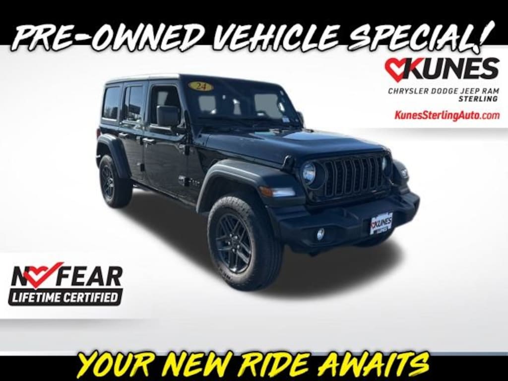 Black Clearcoat 2024 Jeep Wrangler Sport S Sport S with Kunes' No Fear Lifetime Certified Preowned Warranty included!, Comes with all these great features:, ** Apple CarPlay / Android Auto, **Adaptive Cruise Control, ** Security System, ** Steering Wheel Controls, ** Keyless Entry, ** Automatic Headlights, ** Bluetooth, ** Back up Camera, **SIRIUS XM, Apple CarPlay/Android Auto, Automatic Headlamps, Black 3-Piece Hard Top, Corning Gorilla Glass, Integrated roll-over protection, No Soft Top, Overhead airbag, Power Heated Mirrors, Radio: Uconnect 5 w/12.3" Display, Rear reading lights, Rear Window Defroster, Split folding rear seat, Stop-Start Dual Battery System, Sun Visors w/Illuminated Vanity Mirrors, Wheels: 17" x 7.5" Black Steel Styled, Wheels: 17" x 7.5" Gray.