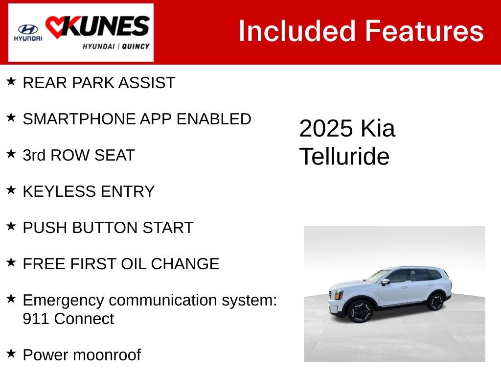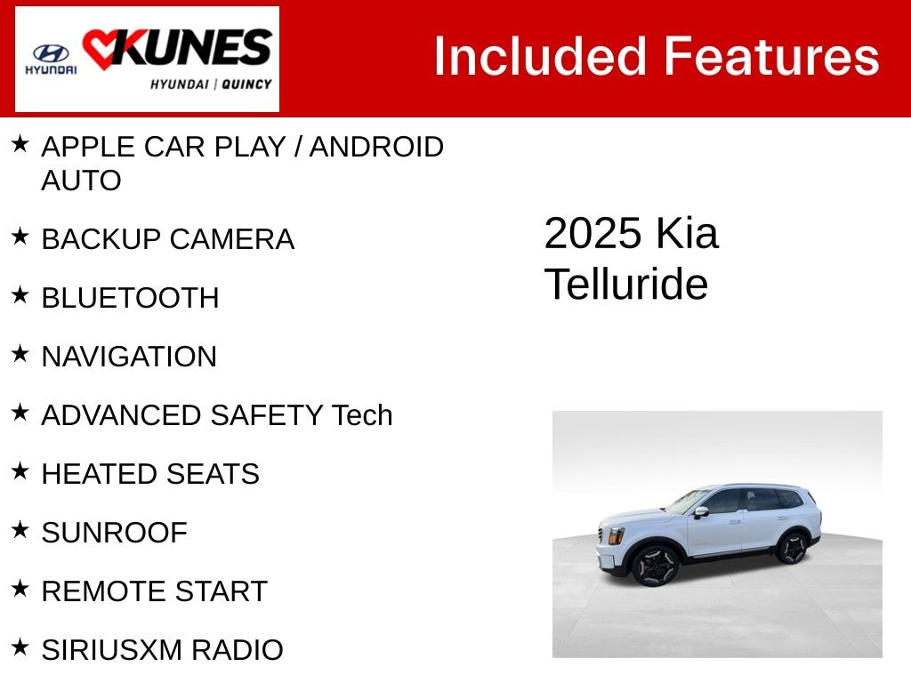 Certified. APPLE CAR PLAY / ANDROID AUTO, BACKUP CAMERA, BLUETOOTH, NAVIGATION, ADVANCED SAFETY Tech, HEATED SEATS, SUNROOF, REMOTE START, SIRIUSXM RADIO, REAR PARK ASSIST, SMARTPHONE APP ENABLED, 3rd ROW SEAT, KEYLESS ENTRY, PUSH BUTTON START, FREE FIRST OIL CHANGE, Emergency communication system: 911 Connect, Power moonroof. CARFAX One-Owner. Clean CARFAX. Glacial White Pearl 2025 Kia Telluride S FWD 8-Speed Automatic 3.8L V6 DOHC 20/26 City/Highway MPG