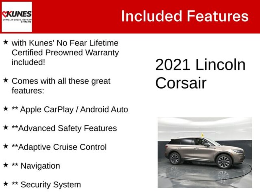 Mocha 2021 Lincoln Corsair Reserve Reserve with Kunes' No Fear Lifetime Certified Preowned Warranty included!, Comes with all these great features:, ** Apple CarPlay / Android Auto, **Advanced Safety Features, **Adaptive Cruise Control, ** Navigation, ** Security System, **Panoramic Sunroof, ** Heated Seats, **Heated and Cooled Seats, **Heated Steering wheel, ** Steering Wheel Controls, ** Premium Wheels, ** Keyless Entry, ** Automatic Headlights, ** Bluetooth, ** Back up Camera, **Rear Park Assist, **SIRIUS XM, Remote Start, 14 Speakers, 3.81 Axle Ratio, Alloy wheels, Auto High-beam Headlights, Auto tilt-away steering wheel, Auto-dimming door mirrors, Bumpers: body-color, Compass, Delay-off headlights, Driver door bin, Driver vanity mirror, Emergency communication system, Four wheel independent suspension, Front anti-roll bar, Front Bucket Seats, Front Center Armrest, Front fog lights, Front reading lights, Fully automatic headlights, Garage door transmitter: HomeLink, Heated door mirrors, Heated Rear Seat, Heated Steering Wheel, Knee airbag, Leather steering wheel, Outside temperature display, Overhead airbag, Overhead console, Panic alarm, Passenger vanity mirror, Power door mirrors, Power Liftgate, Power moonroof: Panoramic Vista Roof, Power steering, Radio data system, Rain Sensing Wipers, Rear anti-roll bar, Rear reading lights, Rear seat center armrest, Rear window wiper, Speed control, Speed-sensing steering, Speed-Sensitive Wipers, Spoiler, Steering wheel mounted A/C controls, SYNC 3 Communications & Entertainment System, Tachometer, Telescoping steering wheel, Trip computer, Turn signal indicator mirrors, Variably intermittent wipers, Windshield Wiper De-Icer. Recent Arrival!