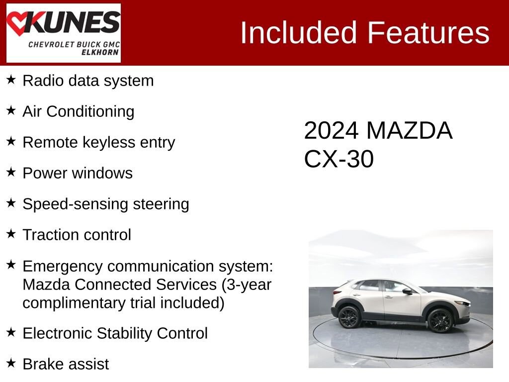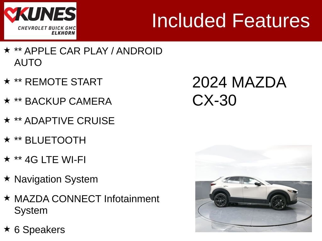 2024 Mazda CX-30 2.5 S Select Sport SKYACTIV® 2.5L 4-Cylinder DOHC 16V 6-Speed Automatic AWD Clean CARFAX. CARFAX One-Owner. 26/33 City/Highway MPG