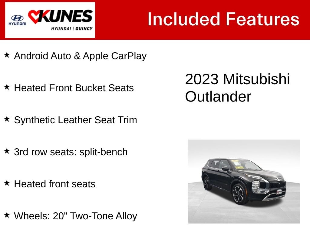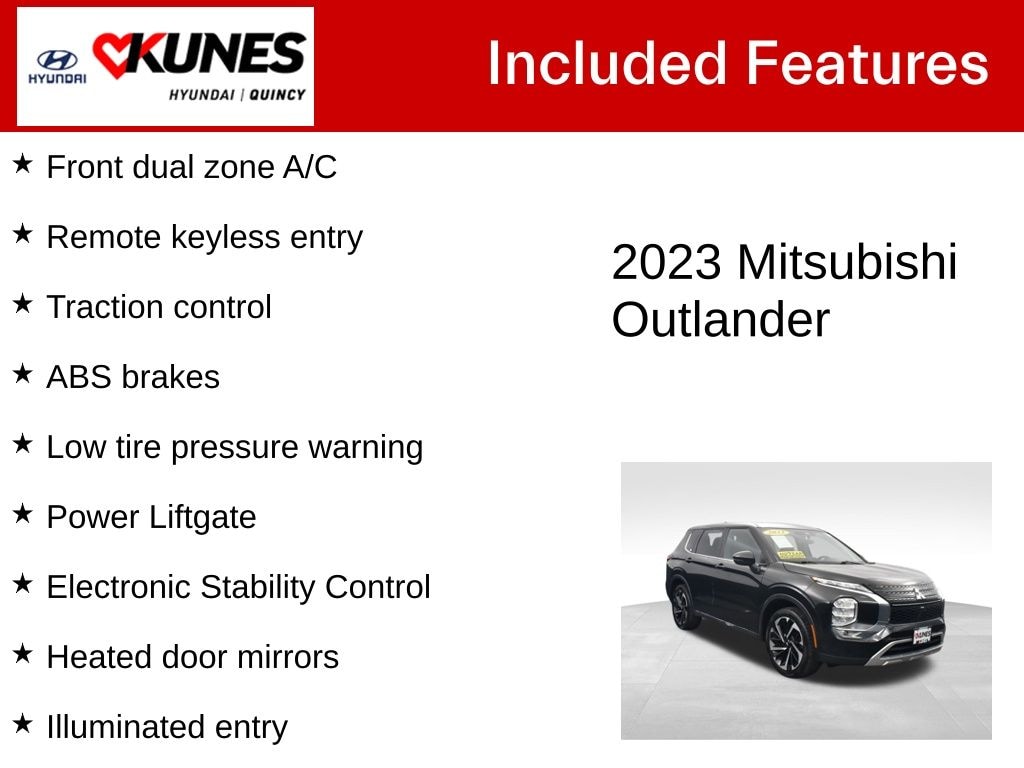 3rd row seats: split-bench, ABS brakes, Android Auto & Apple CarPlay, Electronic Stability Control, Front dual zone A/C, Heated door mirrors, Heated Front Bucket Seats, Heated front seats, Illuminated entry, Low tire pressure warning, Power Liftgate, Remote keyless entry, Synthetic Leather Seat Trim, Traction control, Wheels: 20" Two-Tone Alloy. CARFAX One-Owner. Black 2023 Mitsubishi Outlander SE Special Edition FWD CVT 2.5L 4-Cylinder DOHC 24/31 City/Highway MPG