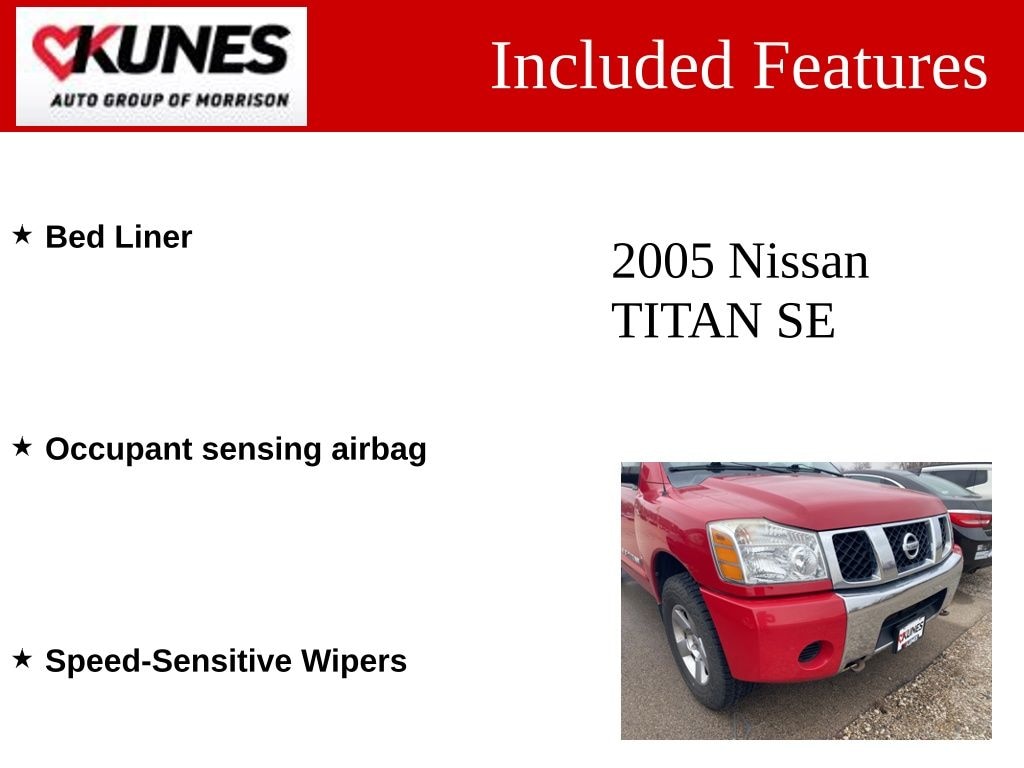 Bed Liner, Titan SE, 4WD, Red Alert, Graphite Cloth, Occupant sensing airbag, Speed-Sensitive Wipers.