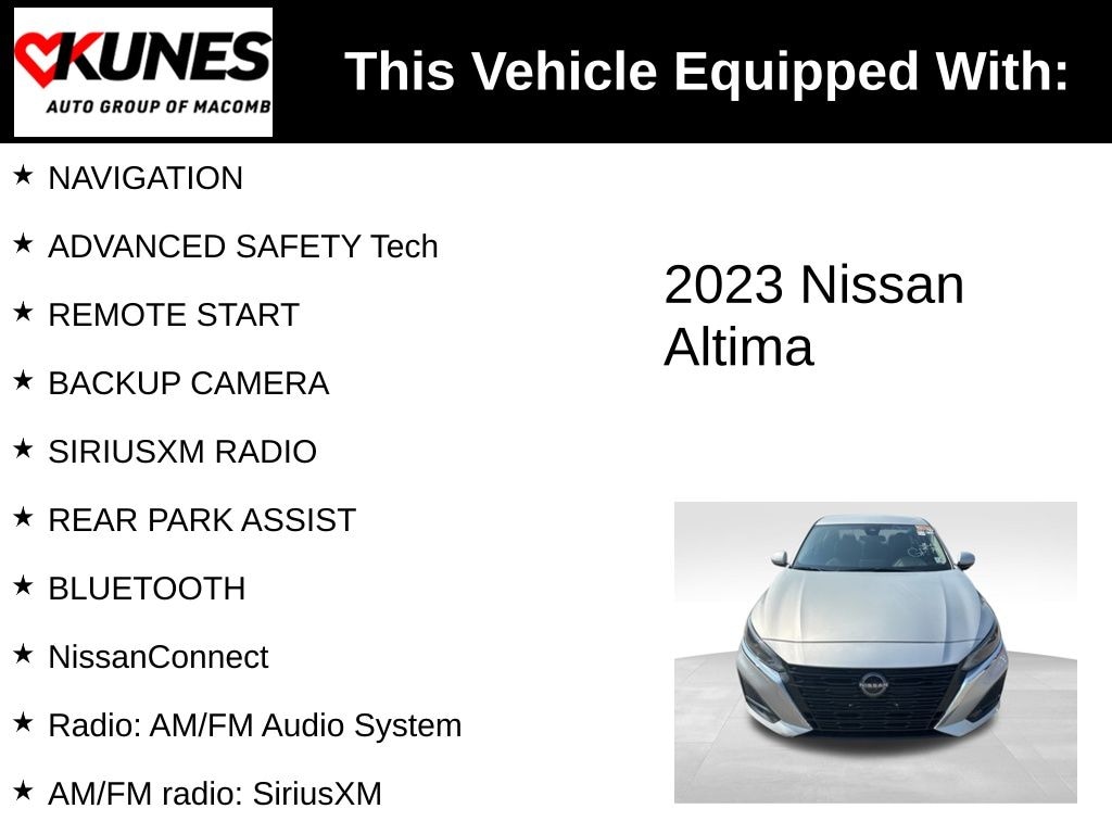 2023 Nissan Altima 2.5 SV NAVIGATION, ADVANCED SAFETY Tech, REMOTE START, BACKUP CAMERA, SIRIUSXM RADIO, REAR PARK ASSIST, BLUETOOTH, CVT with Xtronic, 17" Machined Alloy Wheels, 6 Speakers, AM/FM radio: SiriusXM, Delay-off headlights, Four wheel independent suspension, Fully automatic headlights, NissanConnect, Panic alarm, Radio data system, Radio: AM/FM Audio System, Rear anti-roll bar, Rear Parking Sensors, Rear seat center armrest, Rear side impact airbag, Security system, Speed-sensing steering, Split folding rear seat, Tech Spec Change. Brilliant Silver Metallic
