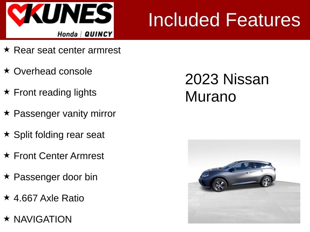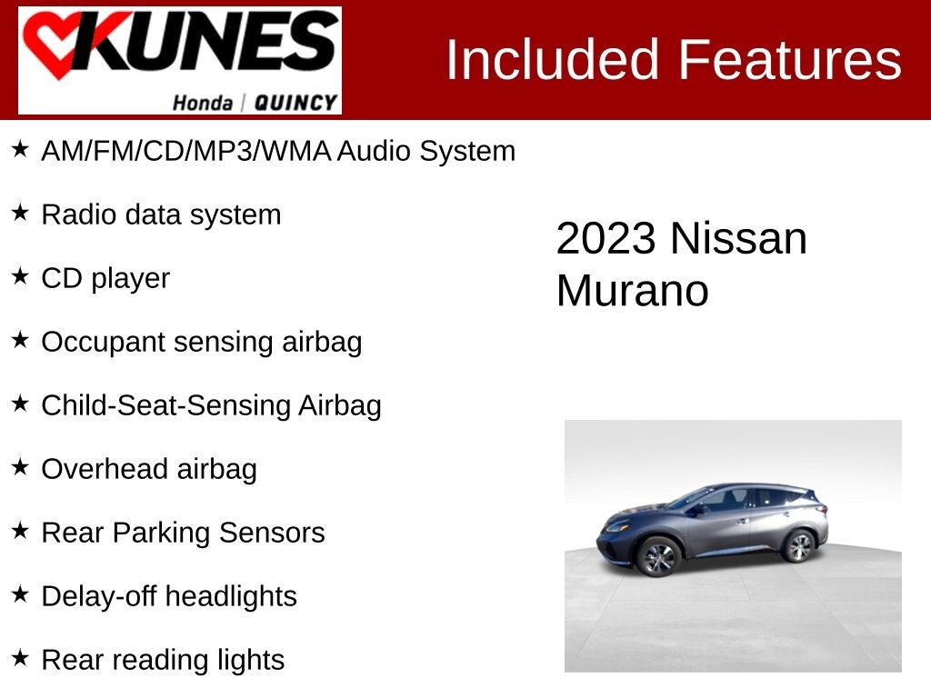 CARFAX One-Owner. Gun Metallic 2023 Nissan Murano S FWD CVT with Xtronic 3.5L V6 DOHC 24V NAVIGATION, ADVANCED SAFETY Tech, SIRIUSXM RADIO, REAR PARK ASSIST, BLUETOOTH, APPLE CAR PLAY/ ANDROID AUTO, CVT with Xtronic, 4.667 Axle Ratio, AM/FM/CD/MP3/WMA Audio System, CD player, Child-Seat-Sensing Airbag, Delay-off headlights, Front Center Armrest, Front reading lights, Occupant sensing airbag, Overhead airbag, Overhead console, Passenger door bin, Passenger vanity mirror, Radio data system, Rear Parking Sensors, Rear reading lights, Rear seat center armrest, Split folding rear seat. 20/28 City/Highway MPG
