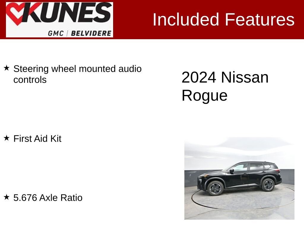 2024 Nissan Rogue SV Super Black FWD 1.5L DOHCRecent Arrival! CARFAX One Owner. Floor Mats, Cargo Area Protector, Seatback Protector included 17 alloy wheels LED headlights, daytime running lights, and tail lamps Dual power heated outside mirrors Forward collision warning with automatic emergency braking Rear automatic braking Blind spot warning and rear cross traffic alert Lane departure warning Intelligent lane intervention Rear parking sensors and backup camera Intelligent driver alertness High beam assist Dual zone automatic temperature control Remote engine start system with intelligent climate control Power driver seat Rear door sunshades Push button start NissanConnect® with 8 color touch-screen display Apple CarPlay®, Android Auto , Bluetooth® Wi-Fi hotspot SiriusXM® radio Steering wheel controls for infotainment