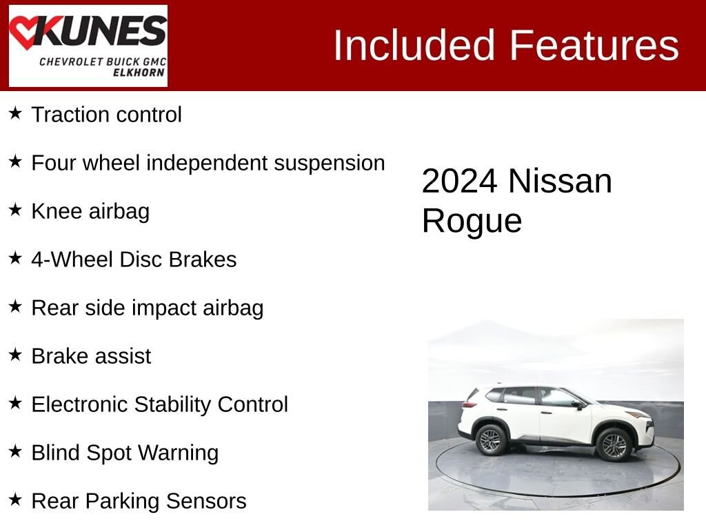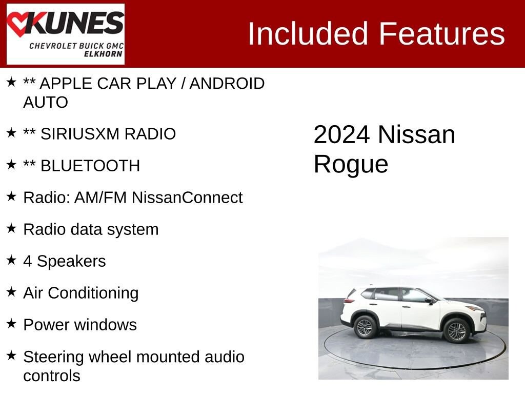 ** APPLE CAR PLAY / ANDROID AUTO, ** SIRIUSXM RADIO, ** BLUETOOTH, 4 Speakers, 4-Wheel Disc Brakes, 5.676 Axle Ratio, Air Conditioning, Auto High-beam Headlights, Blind Spot Warning, Brake assist, Cloth Seat Trim, Delay-off headlights, Driver door bin, Driver vanity mirror, Electronic Stability Control, First Aid Kit, Four wheel independent suspension, Front Bucket Seats, Front Center Armrest, Illuminated entry, Knee airbag, Overhead console, Panic alarm, Passenger door bin, Passenger vanity mirror, Power windows, Radio data system, Radio: AM/FM NissanConnect, Rear Parking Sensors, Rear seat center armrest, Rear side impact airbag, Speed control, Speed-Sensitive Wipers, Split folding rear seat, Spoiler, Steering wheel mounted audio controls, Tachometer, Telescoping steering wheel, Tilt steering wheel, Traction control, Trip computer, Variably intermittent wipers.2024 Nissan Rogue S 1.5L DOHC CVT with Xtronic FWD Clean CARFAX. CARFAX One-Owner. Odometer is 11634 miles below market average! 30/37 City/Highway MPGFind out why our dealerships have won DealerRater.com DEALER OF THE YEAR a whopping 10 TIMES! Call, email, or live chat with one of our friendly sales professionals now to schedule your test drive! Prices shown do not include tax, title, registration and $499 service fees.