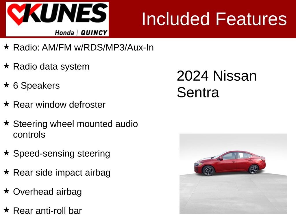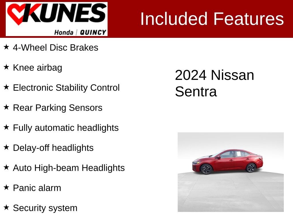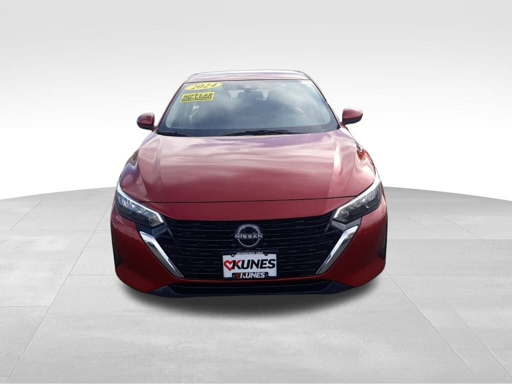CARFAX One-Owner. Clean CARFAX. Scarlet Ember Tintcoat 2024 Nissan Sentra SV FWD CVT with Xtronic 2.0L I4 DOHC NAVIGATION, ADVANCED SAFETY Tech, HEATED SEATS, BACKUP CAMERA, SIRIUSXM RADIO, REAR PARK ASSIST, BLUETOOTH, APPLE CAR PLAY/ ANDROID AUTO, CVT with Xtronic, Charcoal Cloth, 16" Alloy Wheels, 4-Wheel Disc Brakes, 6 Speakers, Alloy wheels, Auto High-beam Headlights, Delay-off headlights, Driver door bin, Electronic Stability Control, Front Bucket Seats, Front Center Armrest, Front reading lights, Fully automatic headlights, Illuminated entry, Knee airbag, Leather steering wheel, Outside temperature display, Overhead airbag, Overhead console, Panic alarm, Passenger door bin, Passenger vanity mirror, Radio data system, Radio: AM/FM w/RDS/MP3/Aux-In, Rear anti-roll bar, Rear Parking Sensors, Rear side impact airbag, Rear window defroster, Security system, Speed control, Speed-sensing steering, Split folding rear seat, Steering wheel mounted audio controls, Tachometer, Technical Spec Change 2, Telescoping steering wheel, Tilt steering wheel, Trip computer, Upgraded Cloth Seat Trim. 30/40 City/Highway MPG Odometer is 1782 miles below market average!