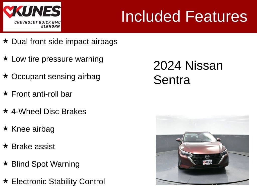 ** APPLE CAR PLAY / ANDROID AUTO, ** BACKUP CAMERA, ** BLUETOOTH, ONE OWNER, CVT with Xtronic, Charcoal Cloth, 16 Alloy Wheels, 4-Wheel Disc Brakes, Alloy wheels, Auto High-beam Headlights, Blind Spot Warning, Brake assist, Bumpers: body-color, Delay-off headlights, Dual front impact airbags, Dual front side impact airbags, Electronic Stability Control, Front anti-roll bar, Front Center Armrest, Front reading lights, Fully automatic headlights, Knee airbag, Leather steering wheel, Low tire pressure warning, Occupant sensing airbag, Overhead airbag, Overhead console, Panic alarm, Power door mirrors, Rear anti-roll bar, Rear Parking Sensors, Security system, Speed control, Speed-sensing steering, Split folding rear seat, Tachometer, Traction control, Trip computer.Certified. Certification Program Details:** NO FEAR LIFETIME CERTIFIED PREOWNED **Over $2,895 of value at no cost!*LIFETIME WARRANTY!*3 Day Exchange Policy!*Complimentary powertrain warranty with ability to upgrade to fully comprehensive coverage and/or extend up to 125,000 miles!*125+ Point Inspection by our factory trained ASE Certified technicians and reconditioned to the highest standards.*Complimentary AutoCheck History Report*Complimentary AutoCheck Buyback Protection*Financing for Everyone - Guaranteed credit approval regardless of credit history!*Over 30 lenders who compete to get you the best financing terms*No payments for up to 90 days!*Weekly, Bi-Weekly, and Monthly Payment Options for all buyers!*First Free Oil Change!*Trade anytime policy - cars, trucks, boats, RVs, motorcycles - as long as we donât have to feed it, you can trade it!Priced below KBB Fair Purchase Price!2024 Nissan Sentra SV 2.0L I4 DOHC CVT with Xtronic FWD CARFAX One-Owner. 30/40 City/Highway MPGFind out why our dealerships have won DealerRater.com DEALER OF THE YEAR a whopping 10 TIMES! Call, email, or live chat with one of our friendly sales professionals now to schedule your test drive! Ask about some of our other Chevrolet, GMC, Buick, Ford, Chrysler, Dodge, Jeep, Ram, Tesla, Kia, Hyundai, INFINITI, BMW, Mercedes, Toyota, Lexus, Nissan, Volkswagen, Hummer, Lincoln, Mazda, Mitsubishi, Honda, Acura, and other vehicles that may have navigation, sunroof, adaptive cruise control, leather, cooled seats, blind spot monitor, lane keep assist, panoramic moonroof, tow hitch, Bose audio, Harman Kardon, Sony, remote start, AWD, all wheel drive, 4x4, wireless charging, sirius XM, heated seats, heated steering wheel, V8, diesel, chrome, bed-liner, luggage rack, sensing, power folding mirrors, 5th wheel, gooseneck, autopilot, self-driving, EV, remote locking tailgate, LT, LTZ, High Country, LX, EX, EX-L, DVD, rear entertainment, rear bucket seats, S, SV, SL, premium, black edition, soft top, hard top, convertible, rally stripes, GT, Shelby, Z71, XL, XLT, Lariat, Denali, SLT, SLE, RS, Rebel, Preferred, Premier, Essence, Limited, Luxury, and more. Prices shown do not include tax, title, registration and $599 service fees.