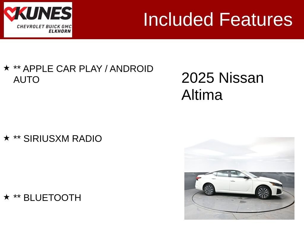 ** APPLE CAR PLAY / ANDROID AUTO, ** SIRIUSXM RADIO, ** BLUETOOTH, CVT with Xtronic.Certified. Certification Program Details:** NO FEAR LIFETIME CERTIFIED PREOWNED **Over $2,895 of value at no cost!*LIFETIME WARRANTY!*3 Day Exchange Policy!*Complimentary powertrain warranty with ability to upgrade to fully comprehensive coverage and/or extend up to 125,000 miles!*125+ Point Inspection by our factory trained ASE Certified technicians and reconditioned to the highest standards.*Complimentary AutoCheck History Report*Complimentary AutoCheck Buyback Protection*Financing for Everyone - Guaranteed credit approval regardless of credit history!*Over 30 lenders who compete to get you the best financing terms*No payments for up to 90 days!*Weekly, Bi-Weekly, and Monthly Payment Options for all buyers!*First Free Oil Change!*Trade anytime policy - cars, trucks, boats, RVs, motorcycles - as long as we donât have to feed it, you can trade it!2025 Nissan Altima 2.5 SV 2.5L 4-Cylinder DOHC 16V CVT with Xtronic FWD Clean CARFAX. CARFAX One-Owner. Odometer is 2880 miles below market average! 27/39 City/Highway MPGFind out why our dealerships have won DealerRater.com DEALER OF THE YEAR a whopping 10 TIMES! Call, email, or live chat with one of our friendly sales professionals now to schedule your test drive! Ask about some of our other Chevrolet, GMC, Buick, Ford, Chrysler, Dodge, Jeep, Ram, Tesla, Kia, Hyundai, INFINITI, BMW, Mercedes, Toyota, Lexus, Nissan, Volkswagen, Hummer, Lincoln, Mazda, Mitsubishi, Honda, Acura, and other vehicles that may have navigation, sunroof, adaptive cruise control, leather, cooled seats, blind spot monitor, lane keep assist, panoramic moonroof, tow hitch, Bose audio, Harman Kardon, Sony, remote start, AWD, all wheel drive, 4x4, wireless charging, sirius XM, heated seats, heated steering wheel, V8, diesel, chrome, bed-liner, luggage rack, sensing, power folding mirrors, 5th wheel, gooseneck, autopilot, self-driving, EV, remote locking tailgate, LT, LTZ, High Country, LX, EX, EX-L, DVD, rear entertainment, rear bucket seats, S, SV, SL, premium, black edition, soft top, hard top, convertible, rally stripes, GT, Shelby, Z71, XL, XLT, Lariat, Denali, SLT, SLE, RS, Rebel, Preferred, Premier, Essence, Limited, Luxury, and more. Prices shown do not include tax, title, registration and $599 service fees.