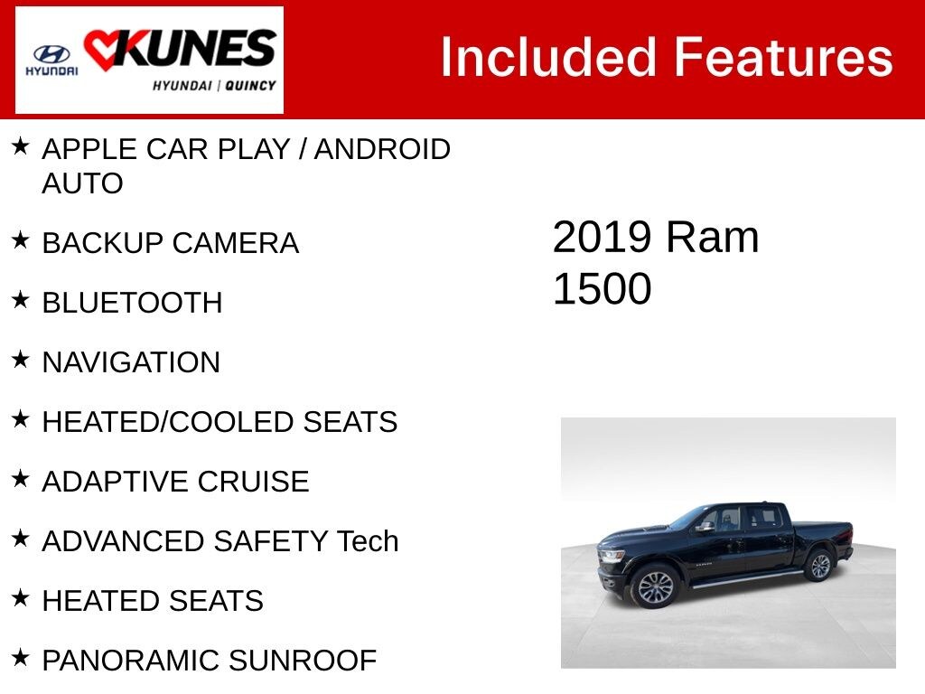 Certified. APPLE CAR PLAY / ANDROID AUTO, BACKUP CAMERA, BLUETOOTH, NAVIGATION, HEATED/COOLED SEATS, ADAPTIVE CRUISE, ADVANCED SAFETY Tech, HEATED SEATS, PANORAMIC SUNROOF, SUNROOF, REMOTE START, SIRIUSXM RADIO, REAR PARK ASSIST, SMARTPHONE APP ENABLED, KEYLESS ENTRY, PUSH BUTTON START, LEATHER INTERIOR, HEATED STEERING WHEEL, FREE FIRST OIL CHANGE, #1 Seat Foam Cushion, 3 Rear Seat Head Restraints, 4 Adjustable Cargo Tie-Down Hooks, 4 Way Front Headrests, 48V Belt Starter Generator, 5-Year SiriusXM Traffic Service, 5-Year SiriusXM Travel Link Service, Adjustable pedals, Apple CarPlay, Black Interior Accents, Body Color Door Handles, Body Color Front Bumper, Body Color Rear Bumper w/Step Pads, Bucket Seats, Bumpers: chrome, Center Console Parts Module, Compass, Dome Dual LED Reading Lamp, Driver door bin, Driver Seat Memory, Foam Bottle Insert (Door Trim Panel), Front Center Armrest w/Storage, Front reading lights, Front wheel independent suspension, Full Length Upgraded Floor Console, Full Speed Forward Collision Warning Plus, Garage door transmitter, GPS Antenna Input, GPS Navigation, Grille B/Color Outline 3 Texture 4, harman/kardon 19 Speaker Premium Sound, HD Radio, Heated Front Seats, Heated Second Row Seats, Heated Steering Wheel, Illuminated entry, Integrated Center Stack Radio, Leather steering wheel, Leather Trim 40/20/40 Bench Seat, Leather Trimmed Bucket Seats, LED Dome/Reading Lamp, Occupant sensing airbag, Outside temperature display, Overhead console, Parallel & Perp Park Assist w/Stop, ParkSense Front/Rear Park Assist w/Stop, Passenger door bin, Passenger vanity mirror, Pedal memory, Power Heated Fold-Away Mirrors, Power passenger seat, Radio: Uconnect 4C Nav w/8.4" Display, Rear anti-roll bar, Rear seat center armrest, Rear step bumper, Remote Tailgate Release, SiriusXM Satellite Radio, Split folding rear seat, Sport Performance Hood, Tachometer, Tailgate Ajar Warning Lamp, Telescoping steering wheel, Tilt steering wheel, Turn signal indicator mirrors, Ventilated Front Seats, Voltmeter, Wheels: 18" x 8" Aluminum Base Painted, Wheels: 20" x 9" Premium Painted w/Inserts, Wireless Charging Pad. Clean CARFAX. Diamond Black Crystal Pearlcoat 2019 Ram 1500 Laramie 4WD 8-Speed Automatic HEMI 5.7L V8 Multi Displacement VVT Odometer is 6908 miles below market average!