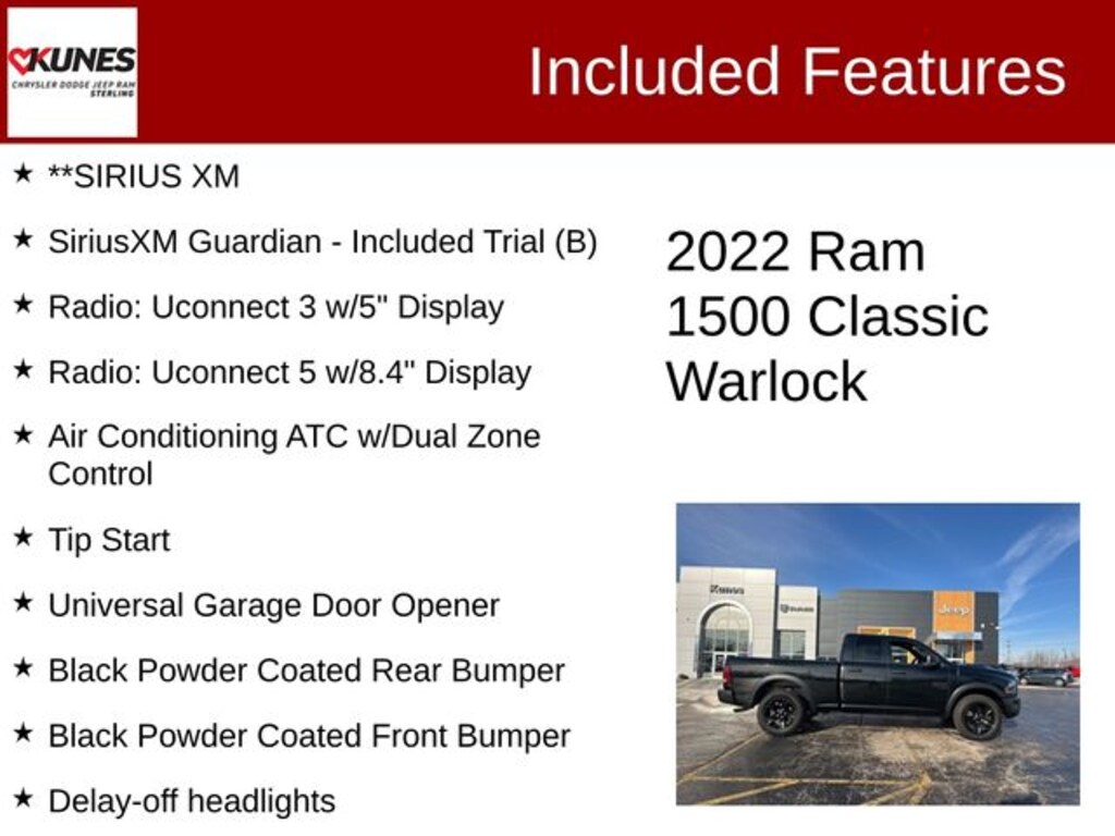 Diamond Black Crystal Pearlcoat 2022 Ram 1500 Classic Warlock Warlock with Kunes' No Fear Lifetime Certified Preowned Warranty included!, Comes with all these great features:, ** Apple CarPlay / Android Auto, ** Security System, ** Premium Wheels, ** Keyless Entry, ** Automatic Headlights, ** Bluetooth, ** Back up Camera, **Rear Park Assist, **SIRIUS XM, 40/20/40 Split Bench Seat, 4G LTE Wi-Fi Hot Spot, 4x4 Flat Black Badge, 8.4" Touchscreen Display, Air Conditioning ATC w/Dual Zone Control, Auto-Dimming Exterior Mirrors, B-Pillar Black Out, Black Exterior Truck Badging, Black Grille w/RAM Lettering, Black Headlamp Filler Panel, Black Powder Coated Front Bumper, Black Powder Coated Rear Bumper, Black RAM Head Tailgate Badge, Black Wheel Flares, Bumpers: chrome, Center Hub, Charge Only Remote USB Port, Cloth 40/20/40 Bench Seat, Cluster 7.0" TFT Color Display, Delay-off headlights, Driver door bin, Exterior Mirrors Courtesy Lamps, Front Armrest w/3 Cupholders, Front Center Armrest w/Storage, Front reading lights, Front Wheel Well Liners, Glove Box Lamp, GPS Antenna Input, Illuminated entry, Integrated Center Stack Radio, LED Bed Lighting, Media Hub (2 USB, AUX), Outside temperature display, Overhead console, Overhead Console w/Garage Door Opener, Passenger door bin, Radio: Uconnect 3 w/5" Display, Radio: Uconnect 5 w/8.4" Display, Rear Dome w/On/Off Switch Lamp, Rear step bumper, Remote USB Port, Rotary Shifter-Black, Semi-Gloss Black Hub, SiriusXM Guardian - Included Trial (B), Sport Tail Lamps, Steering Wheel Mounted Audio Controls, Sun Visors w/Illuminated Vanity Mirrors, Tachometer, Tip Start, Universal Garage Door Opener, USB Host Flip, Voltmeter, Warlock Interior Accents, Wheels: 20" x 9" Semi-Gloss Black Aluminum.
