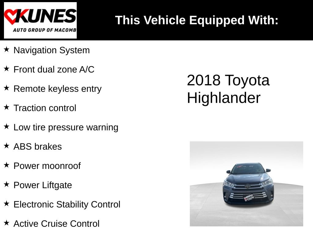 2018 Toyota Highlander XLE AWD, ABS brakes, Active Cruise Control, Alloy wheels, Electronic Stability Control, Front dual zone A/C, Heated door mirrors, Heated Front Bucket Seats, Heated front seats, Illuminated entry, Leather Seat Trim, Low tire pressure warning, Navigation System, Power Liftgate, Power moonroof, Remote keyless entry, Traction control. Shoreline Blue Pearl
