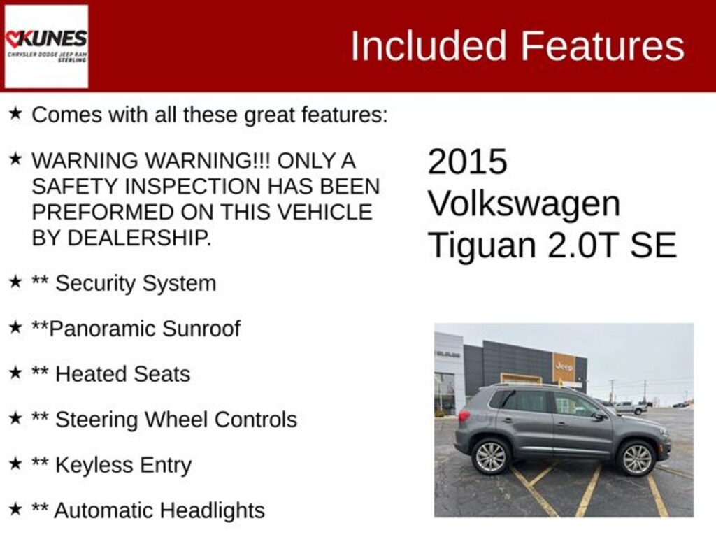 Pepper / Gray 2015 Volkswagen Tiguan SE 4Motion w/Appearance SE Comes with all these great features:, WARNING WARNING!!! ONLY A SAFETY INSPECTION HAS BEEN PREFORMED ON THIS VEHICLE BY DEALERSHIP., ** Security System, **Panoramic Sunroof, ** Heated Seats, ** Steering Wheel Controls, ** Keyless Entry, ** Automatic Headlights, ** Bluetooth, ** Back up Camera, **SIRIUS XM, Front Center Armrest w/Storage, Leather Shift Knob, Occupant sensing airbag, Overhead airbag, Overhead console, Panic alarm, Rear reading lights, Rear seat center armrest, Roof rack: rails only. Recent Arrival!