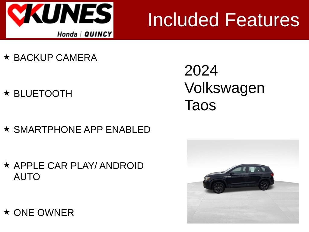 CARFAX One-Owner. Clean CARFAX. Gray 2024 Volkswagen Taos 1.5T S FWD 8-Speed Automatic with Tiptronic 1.5L I4 Turbocharged DOHC 16V LEV3-SULEV30 158hp BACKUP CAMERA, BLUETOOTH, SMARTPHONE APP ENABLED, APPLE CAR PLAY/ ANDROID AUTO, ONE OWNER. 28/36 City/Highway MPG