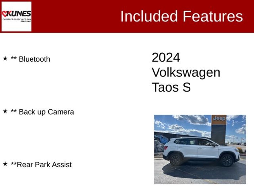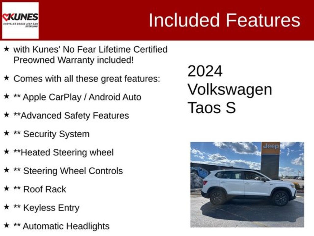 White 2024 Volkswagen Taos 1.5T S with Kunes' No Fear Lifetime Certified Preowned Warranty included!